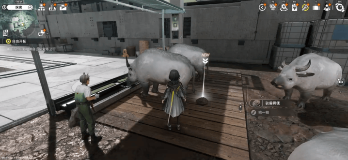 尽管《明日方舟:终末地》采用的是大箱庭地图,探索起来仍有大量彩蛋有待挖掘。本人停留时间最久的地点要数城市内部,武陵城完全不同于市面上常见的刻板中式古风印象,却处处都具备东方气息,除了完成任务,我还可以四处乱逛寻找正能量标语,或者闯进广场舞阵营、驻足热闹的火锅店,亦或是围观路边挂着绿牌的驮兽,一切都极具新鲜感。