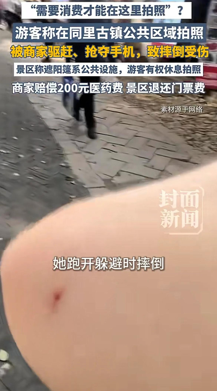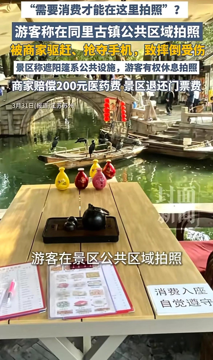 近日,江苏苏州同里古镇的一起纠纷引发热议。一位游客在景区公共区域的小桥上拍照留念,却被附近商家粗暴驱赶,声称"不消费就不能在这拍"。