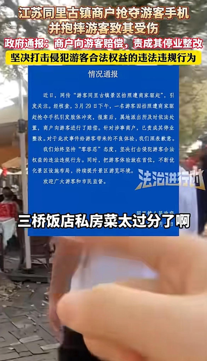 事件发生后,同里古镇管理方迅速表态,认定商家行为违规,并做出了赔偿游客、退还门票等处理。