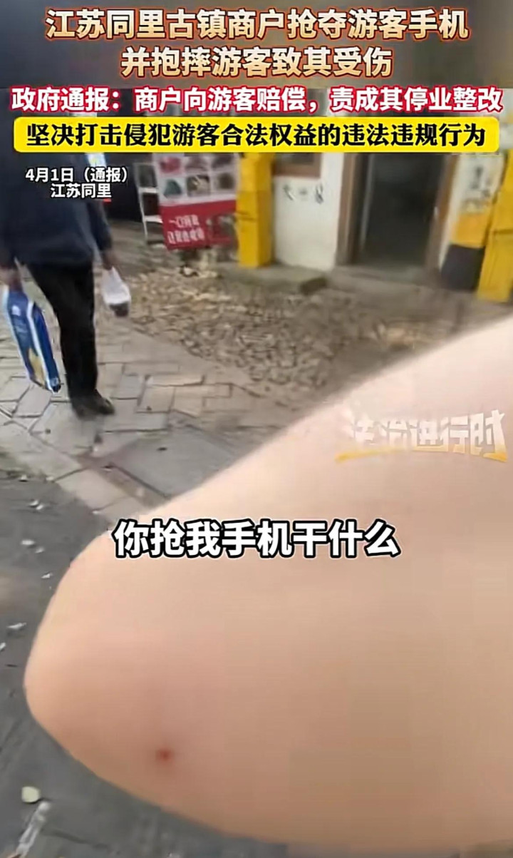 双方争执升级,商家竟抢夺游客手机,导致游客摔倒受伤。