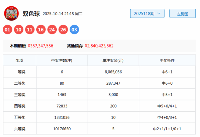 开奖回顾:第2025118期双色球奖号为01、10、11、16、24、26+03。区间比:3:1:2,奇偶比:2:4,首尾间距:25。