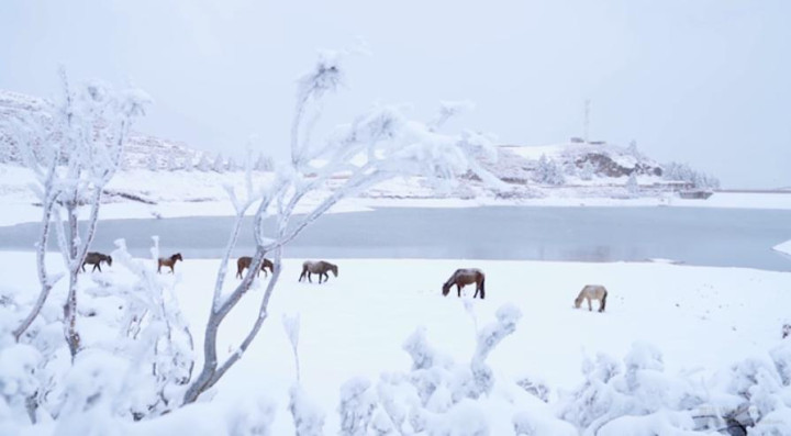 乌蒙大草原冰雪世界是盘州冬季最具特色的景观。海拔2000米至2857米的高原草场,在冬季呈现“山舞银蛇,原驰蜡象”的壮丽景象。游客在此不仅能欣赏雪景,还可能邂逅罕见的自然奇观“草原佛光”。雪地中觅食的牛羊和马群,为这片银装素裹的世界增添了生机与活力。