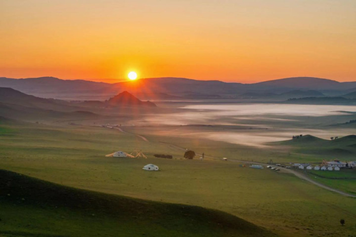 傍晚时,夕阳把草原染成金红色,牛羊慢悠悠地回圈,尾巴甩得懒洋洋的。远处的山影朦胧,像披了件灰蓝色的外套。坐在草原上看日落,直到最后一缕光消失在山后,才懂“辽阔”两个字的分量——不是照片里的风景,是风拂过发梢时,心里那股松快的劲儿。