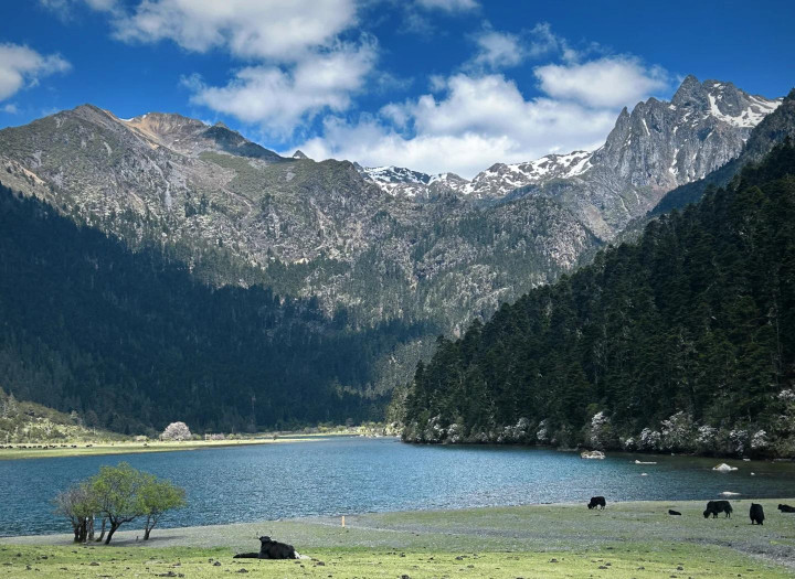 沿湖徒步三小时,脚下是软乎乎的草甸,踩上去像陷进棉花里,偶尔能看见牧民的牦牛甩着尾巴走过,脖子上的铜铃“叮铃——叮铃——”响,声音在山谷里飘得很远。累了就坐在湖边的黑石头上,不用找角度,手机随手一抬,就是“无滤镜胜有滤镜”的通透——蓝的湖、白的云、绿的草,连风的影子都能拍进画面里。
